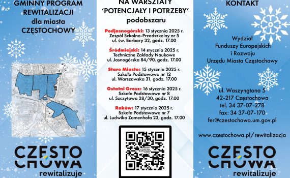 Szanowni Państwo, w imieniu Prezydenta Miasta Częstochowy, zapraszamy do wzięcia udziału w otwartych, bezpłatnych warsztatach „Potencjały i potrzeby” rewitalizacji. Zajęcia odbędą się w dniach 13-17 […]