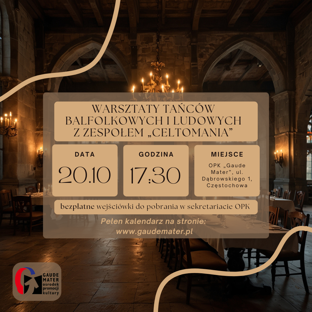 Poczuj rytm tradycyjnych melodii i daj się porwać tanecznej energii! Zespół „Celtomania” poprowadzi warsztaty, podczas których każdy – niezależnie od doświadczenia – będzie mógł spróbować swoich sił w balfolkowych i ludowych tańcach.
